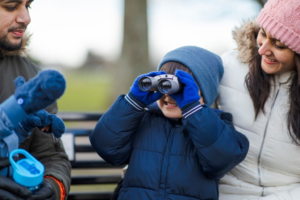 Bring binoculars (or pretend ones!) to spot birds, squirrels, and trees. Pause to listen for chirping or rustling leaves. Combine this with the scavenger hunt for added fun and focus.