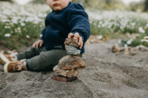 Gather sticks and rocks during your walk and challenge your toddler to stack them into little towers. See who can make the tallest stack or count each item as you add it. This simple activity builds fine motor skills and keeps things calm and engaging.