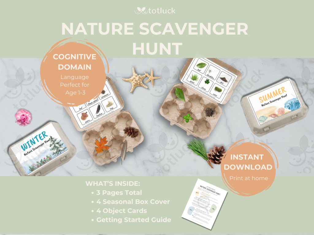 Make outdoor time purposeful with a nature scavenger hunt. Explore your backyard, park, or trail with treasures like pinecones, sticks, and rocks. Bring an egg carton to collect and sort items, turning it into a fun sorting game for little hands. Our Nature Scavenger Hunt Kit includes seasonal box covers and object cards with real-life photos. Print, decorate, and start your hunt today!