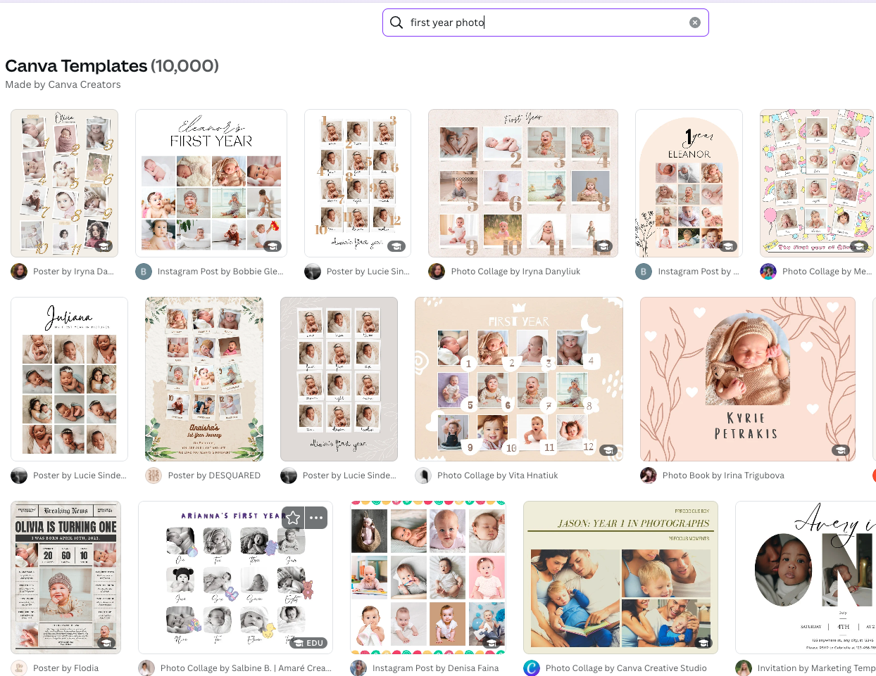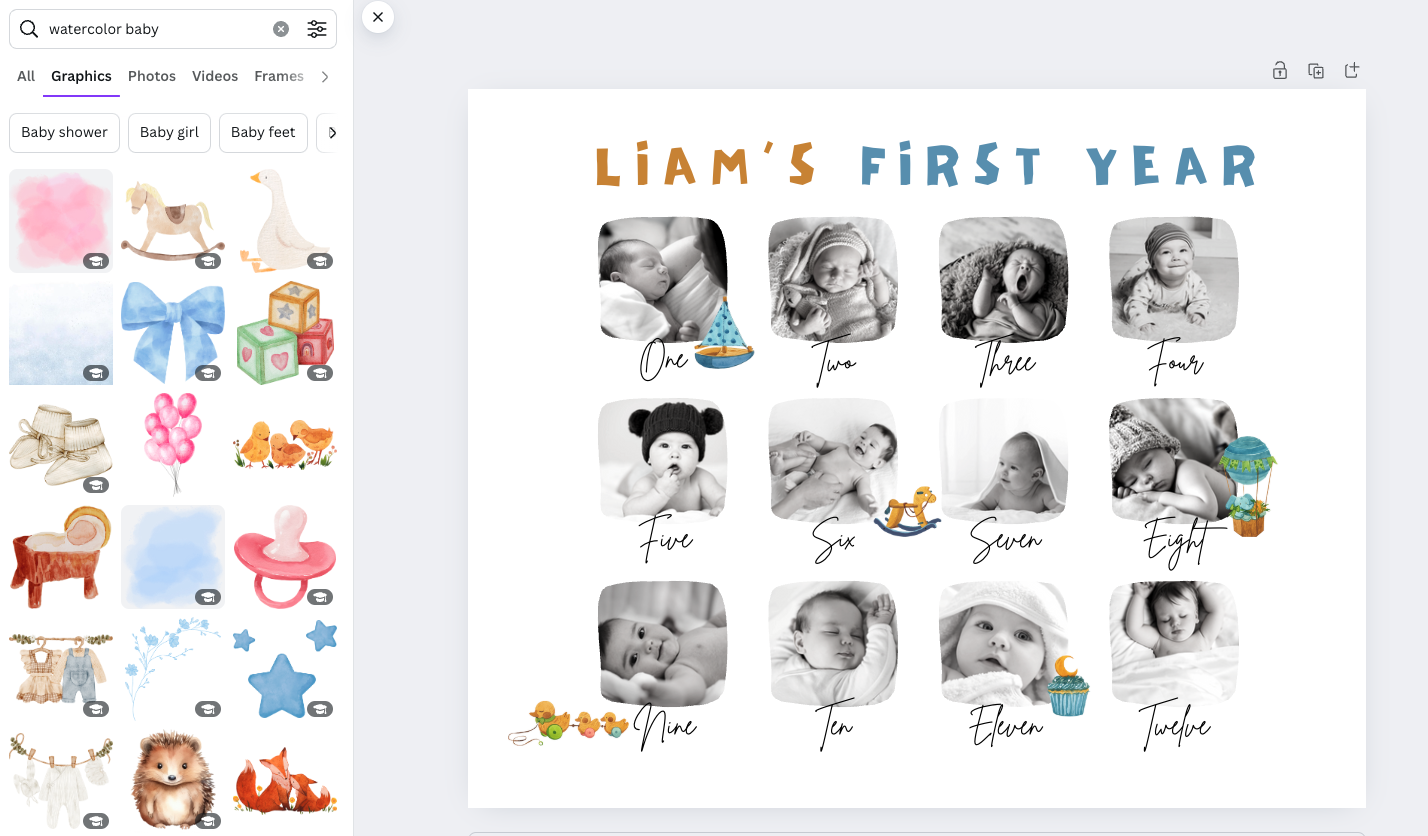 Canva’s drag-and-drop interface and wide range of templates make it ideal for busy parents. For instance, designing a “My First Year” photo frame is simple and fun. Below is a sneak peek of how Canva’s templates can help you create a unique keepsake to celebrate milestones: